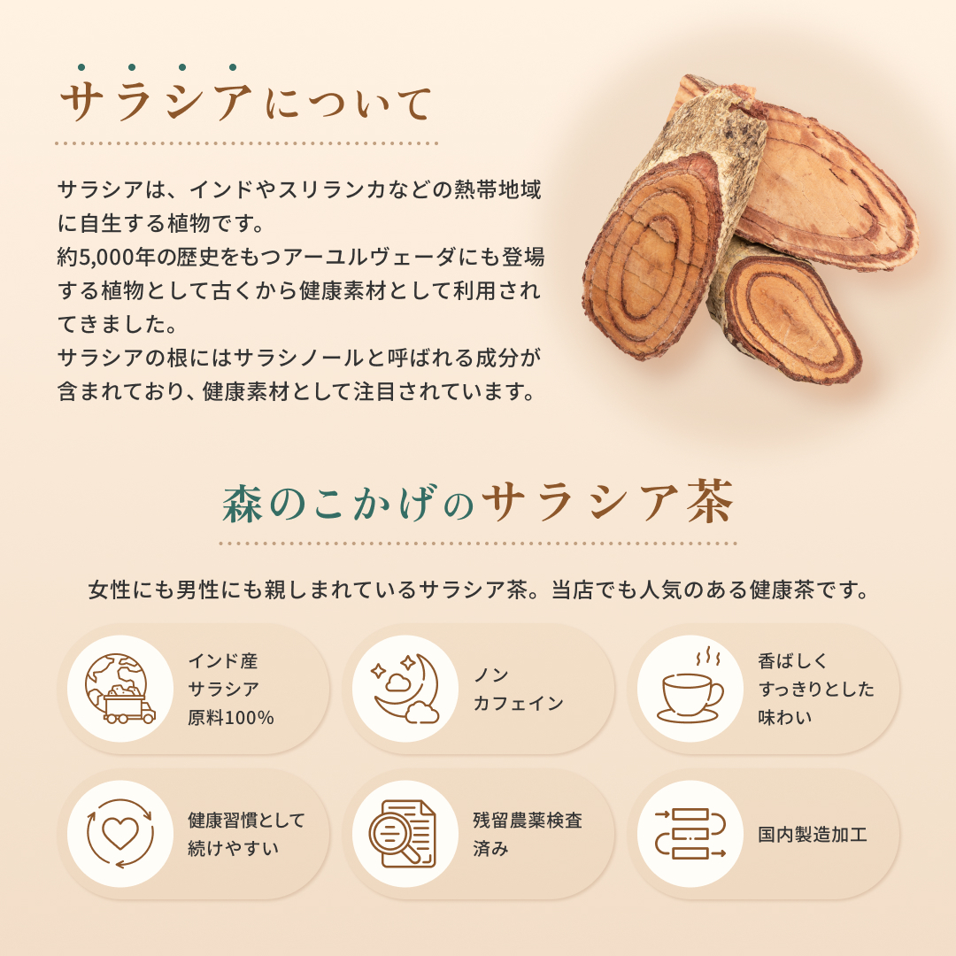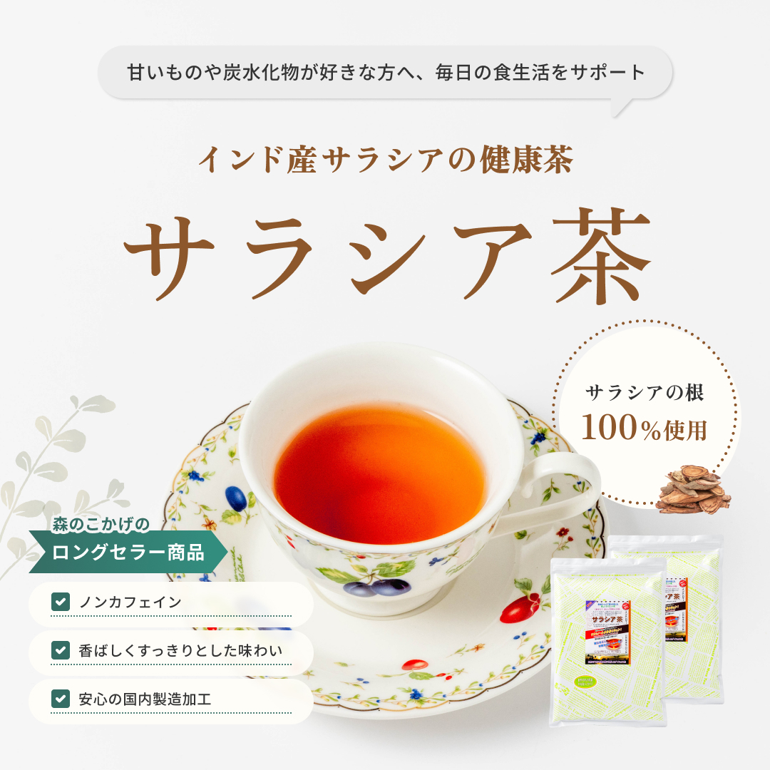 森のこかげのサラシア茶は、サラシア100%を使用した健康茶です。
