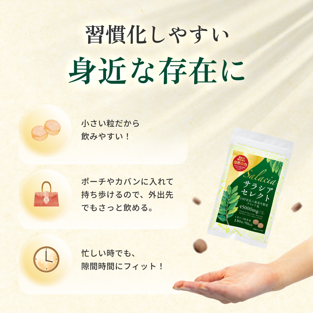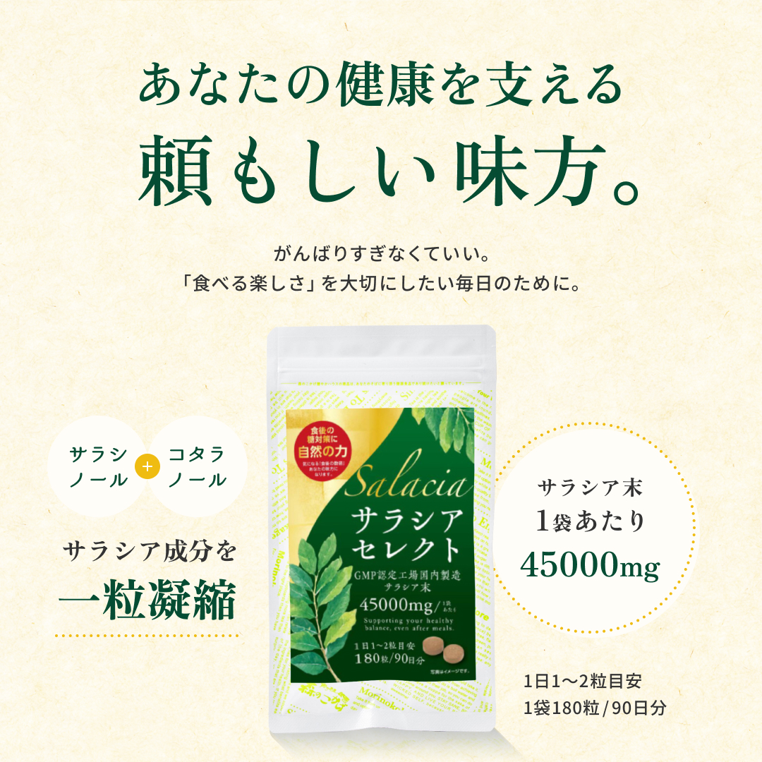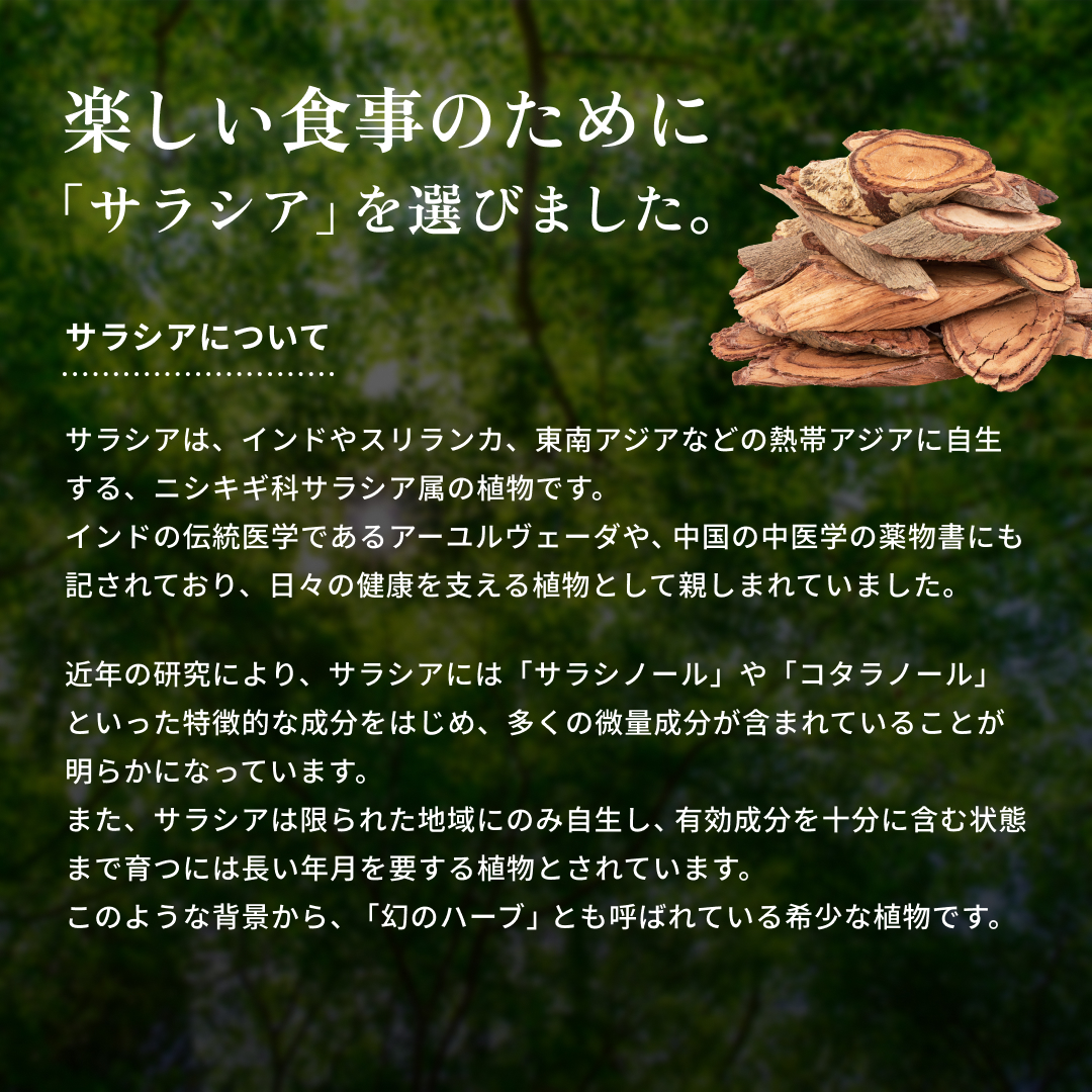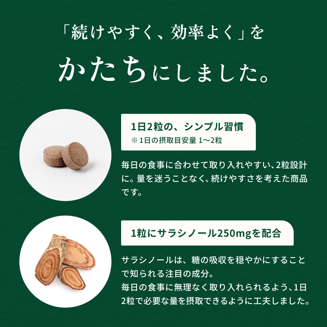 食後の“気になる数値”に寄り添う植物素材 サラシアは、古くから健康維持に用いられてきた植物由来素材。 食事で摂りがちな糖質に着目し、 毎日の食生活を内側からサポートしたい方に選ばれています。 打錠タイプだから“味・手間”のストレスがない お茶や粉末タイプと違い、 水と一緒に飲むだけの打錠(タブレット)タイプ。