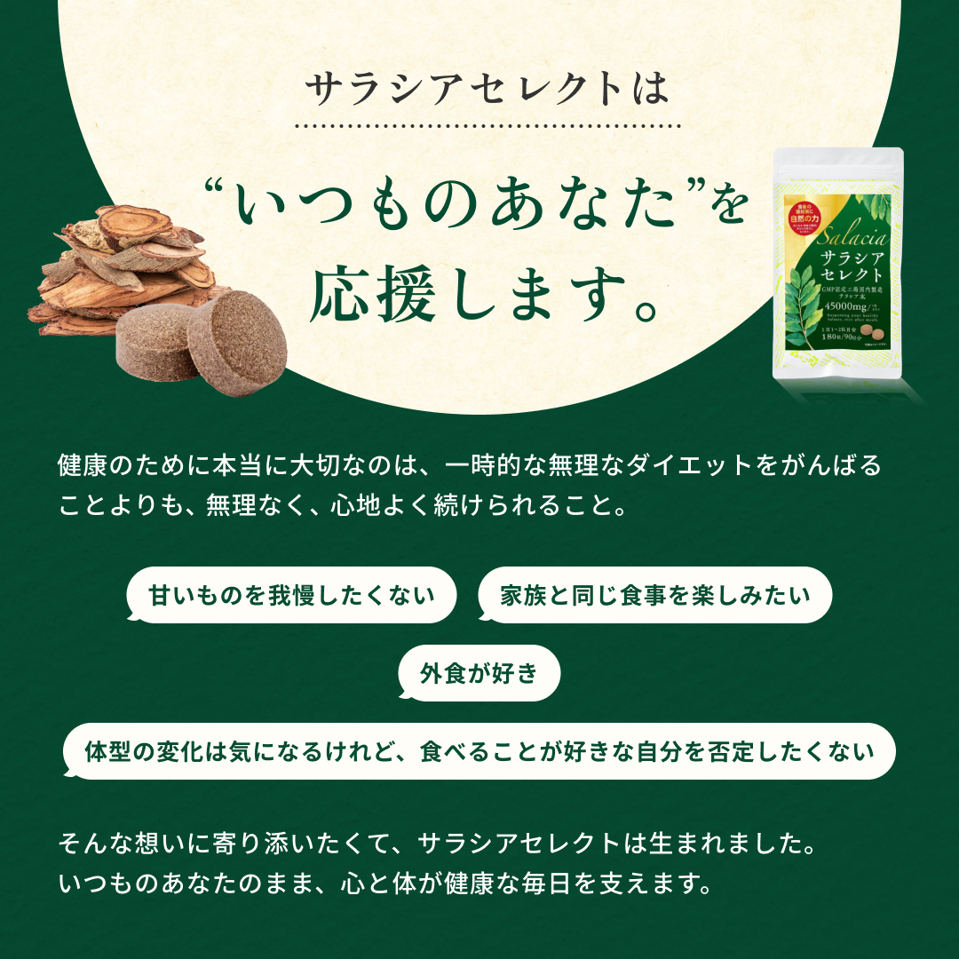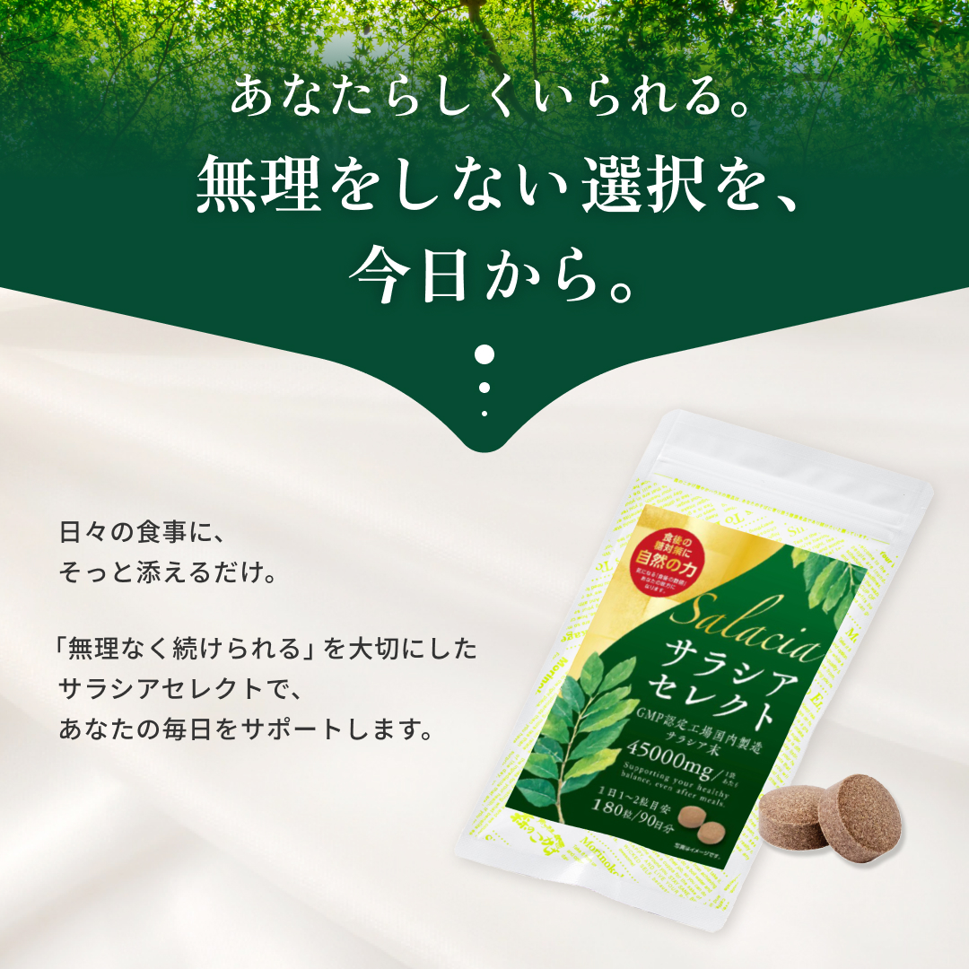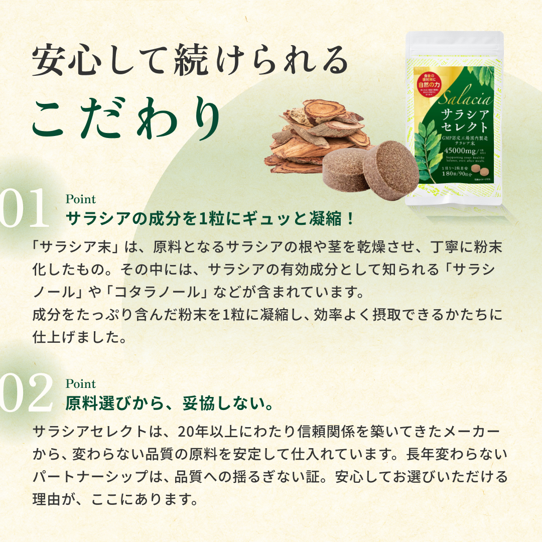 食後の“気になる数値”に寄り添う植物素材 サラシアは、古くから健康維持に用いられてきた植物由来素材。 食事で摂りがちな糖質に着目し、 毎日の食生活を内側からサポートしたい方に選ばれています。 打錠タイプだから“味・手間”のストレスがない お茶や粉末タイプと違い、 水と一緒に飲むだけの打錠(タブレット)タイプ。