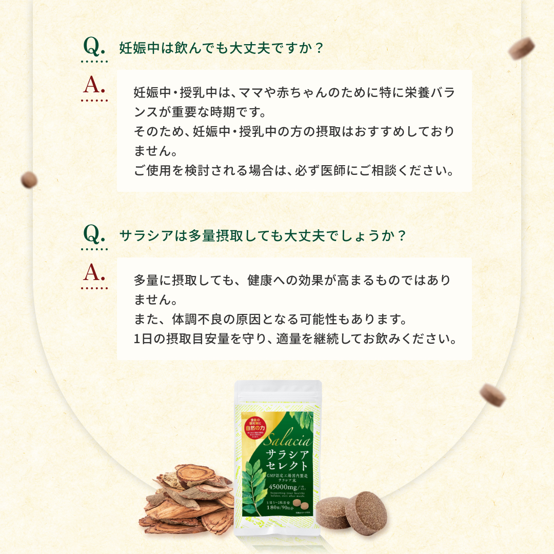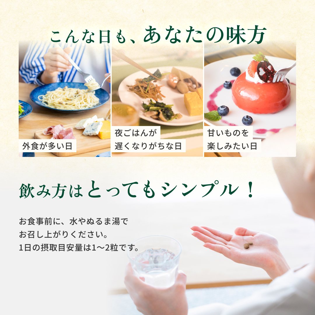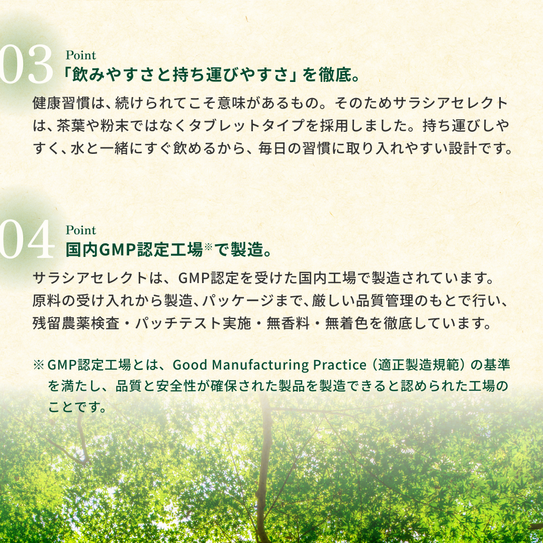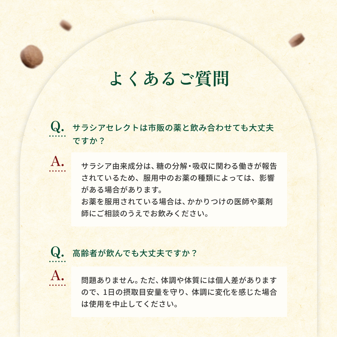 食後の“気になる数値”に寄り添う植物素材 サラシアは、古くから健康維持に用いられてきた植物由来素材。 食事で摂りがちな糖質に着目し、 毎日の食生活を内側からサポートしたい方に選ばれています。 打錠タイプだから“味・手間”のストレスがない お茶や粉末タイプと違い、 水と一緒に飲むだけの打錠(タブレット)タイプ。