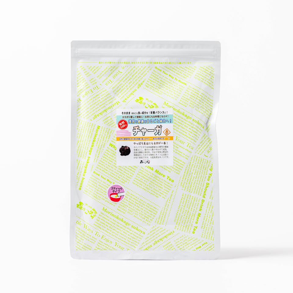 チャーガは栄養豊富な白樺等の樹液を養分とし、数年から数十年かけて成長していきます。そして最後は白樺の木を枯らしてしまうほどの生命力を持っています。その表面は菌核と呼ばれ、黒くひび割れたような亀裂が縦横に走り、とても固く一見炭化しているようにも見えます。中の部分は子実体と呼ばれ茶褐色をしており全体的にキノコとは似つかない形状をしております。大変貴重なキノコの一種です。さまざまな健康維持にどうぞお役立てください。